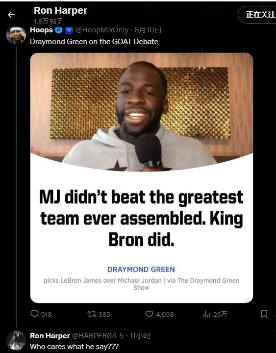 8月11日讯 此前,追梦曾在播客节目中将老詹排在其个人历史榜单前五,位置在乔丹之前,因为乔丹没击败过史上最伟大的球队,但詹姆斯做到了(击败了2016年的勇士)。对此乔丹前队友罗恩-哈珀发文回应了追梦的言论。